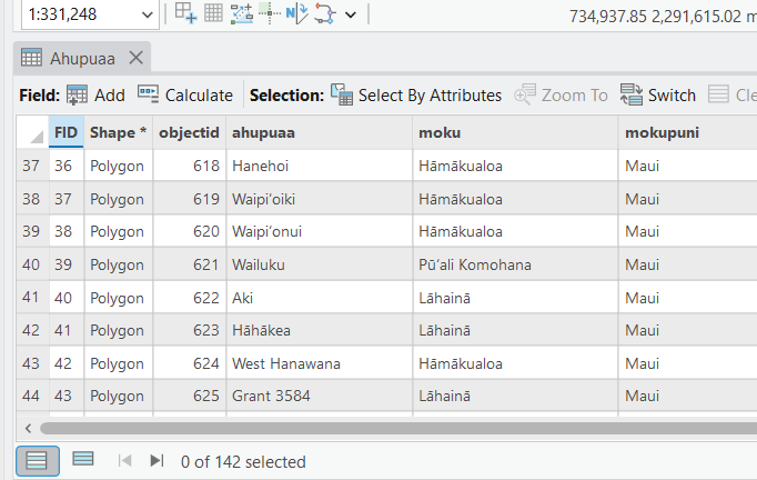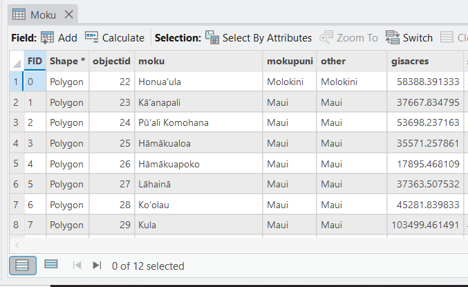The Maui Moku Puni Geodatabase (MMP-GDB) Moku data layer attribute table with associated data fields is the detailed information behind the visual map.