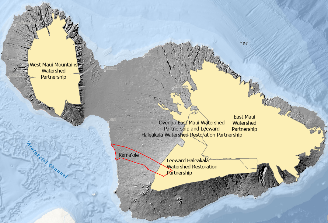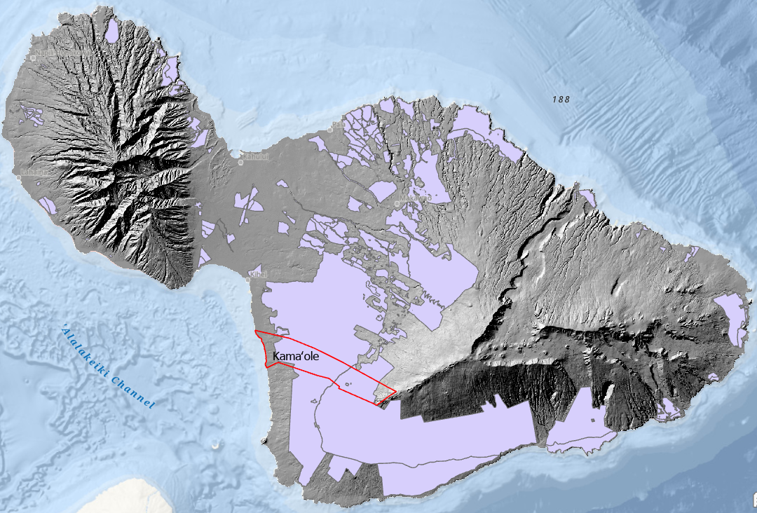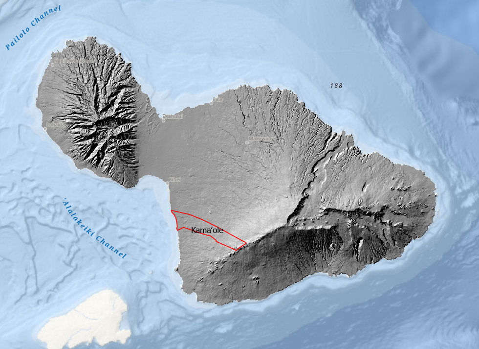 The Maui Moku Puni digital Hillshade layer from the Hawaii Statewide GIS System and the location of the Kamaole Ahupuaa outlined in red along Maui’s leeward Southwest coast.
