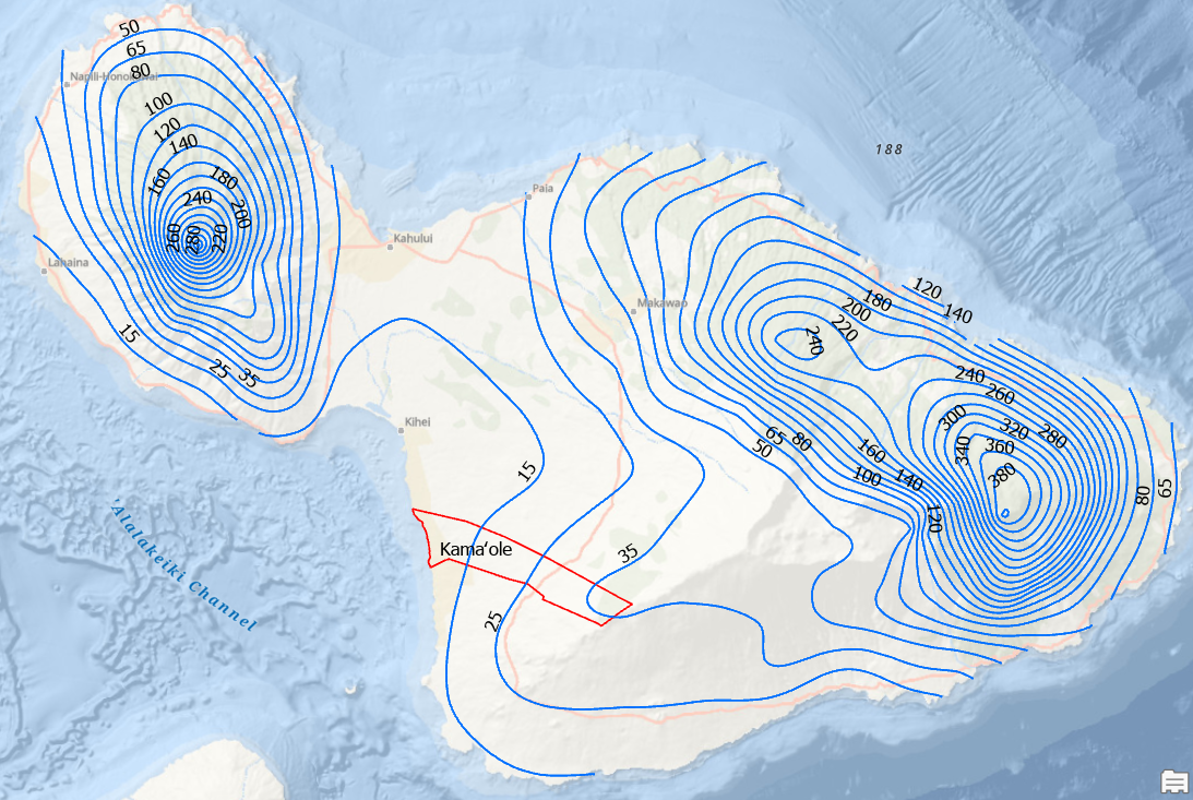The Kamaole Ahupuaa is located in the rain shadow of the Haleakala volcano. Rainfall contours in inches per year make for easy visualization of wet and dry areas of the Maui Moku Puni. The network of drainage ditches, canals and pipelines constructed in the previous century to supply the sugar cane industry with water are drawn in purple.