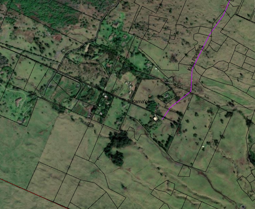 Satellite imagery of Upcountry Kamaole farm and pasture lands in the area receiving 25 - 35 inches of average annual rainfall. The Kula Pipeline is shown in purple. Individually owned Maui County Tax Map parcels are outlined with black lines.