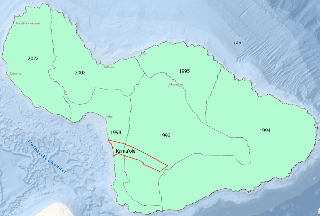 Maui County Council District boundaries divide the Kamaole Ahupuaa separating the lower makai section from upper mauka area. Today there is a patchwork of jurisdictions managing different aspects of the Maui Moku Puni.