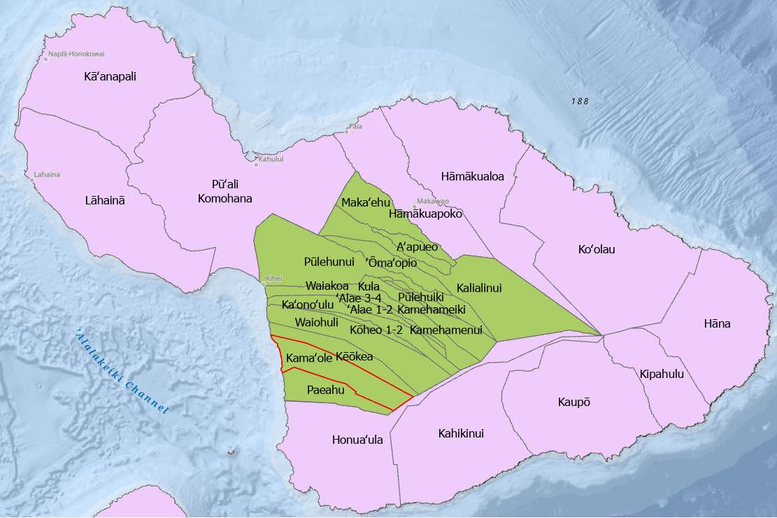 The Kamaole Ahupuaa outlined in red is located on Maui’s dry southwest leeward coast. It is one of seventeen ahupuaa located within the Kula Moku.