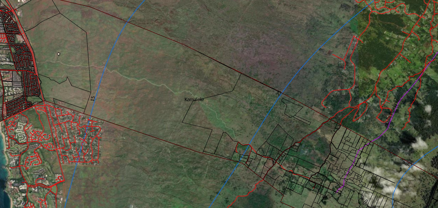 Satellite imagery base map with Maui County Tax Map data layer isolated to the Kamaole Ahupuaa.
