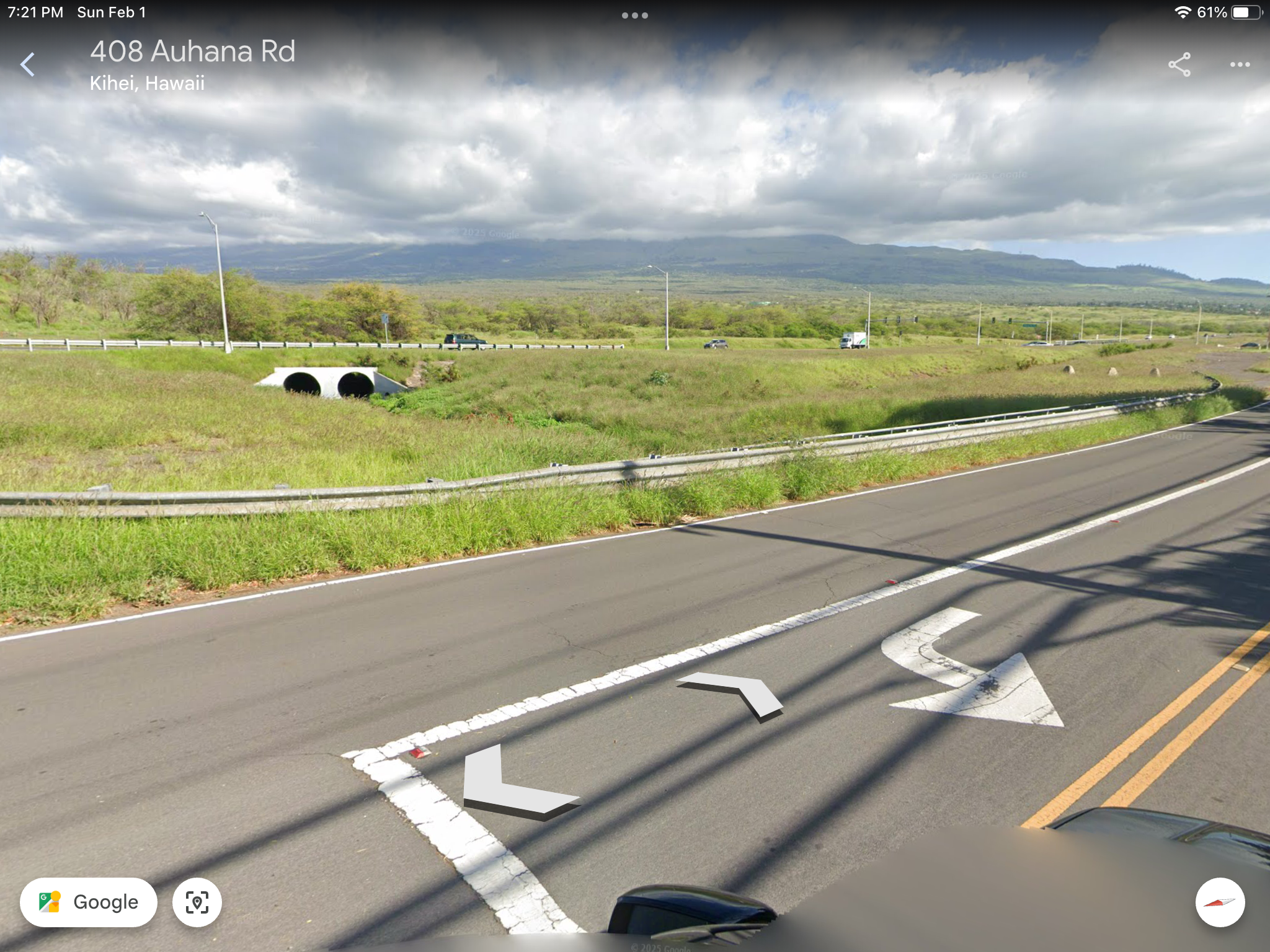 Google Earth screen shots looking at Drainage 2 as it passes under Highway 31 and flows through the lower neighborhoods to Kamaole 1 Beach.
